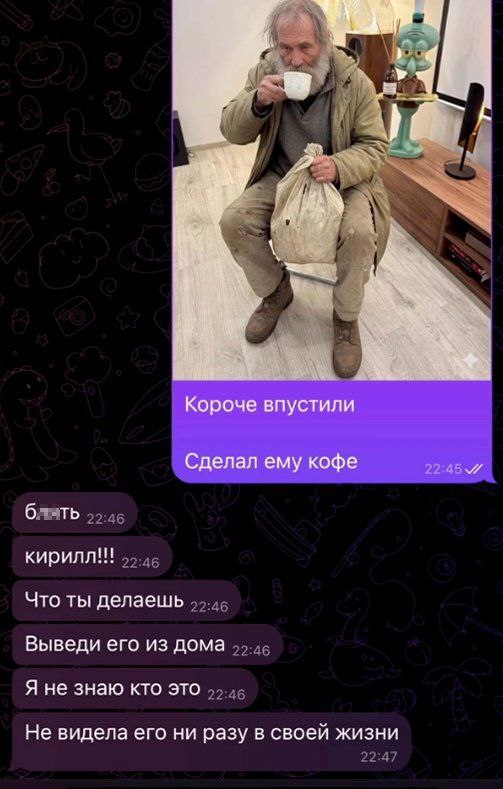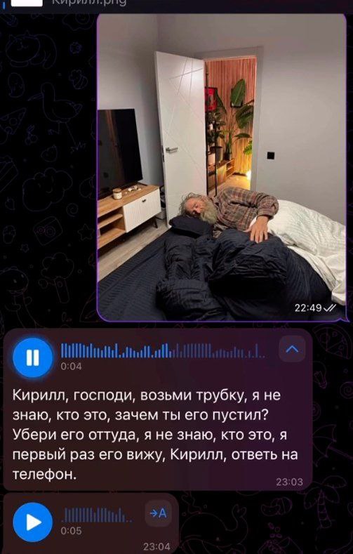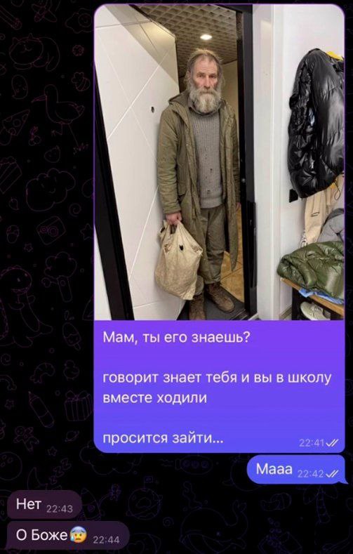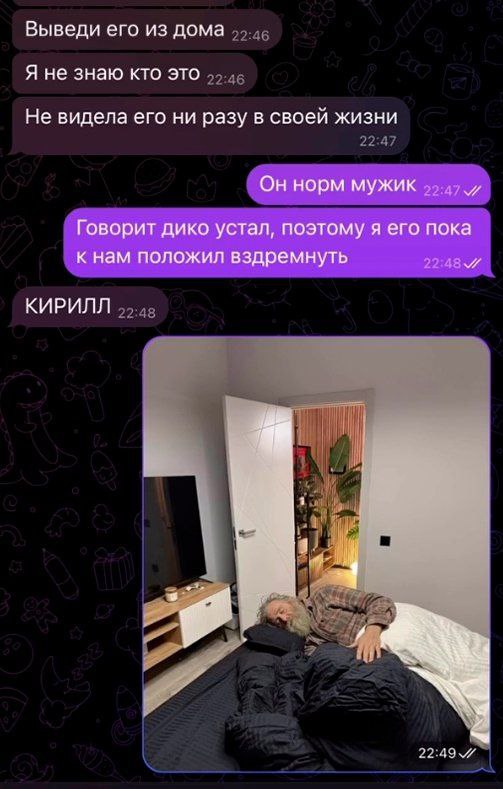 Сначала он обращается к мужу: "Здравствуйте, Алексей! Я так рад вас видеть. Ваша жена сегодня с вами?" А потом, неловко улыбаясь, добавляет: "Как там Наташа? Надеюсь, ей понравились цветы, которые вы вчера ей заказывали?"