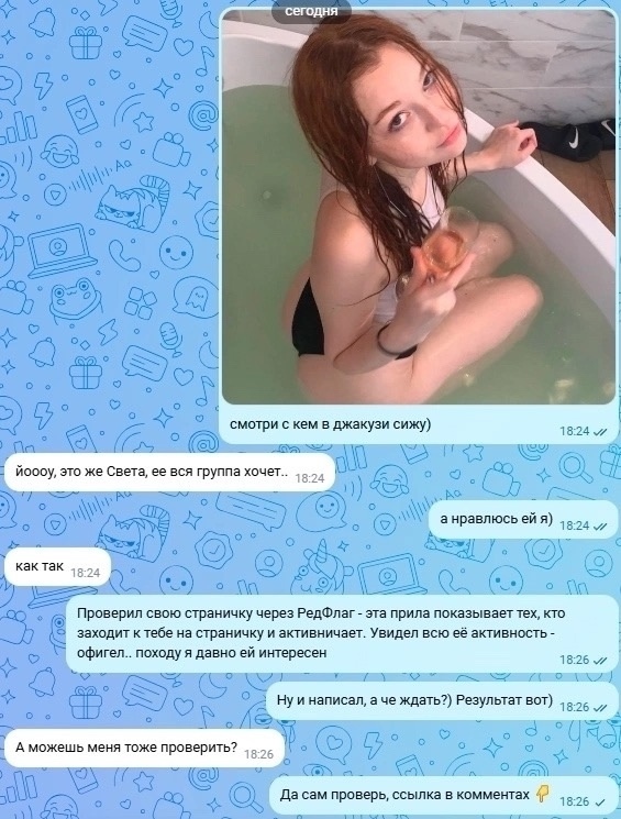 а секрет и фишка тут всего одна: я тупо не боюсь быть инициативным. серьезно, это единственное, что отличает меня от других: я не боюсь писать первым, предлагать что-то или звать к себе в гости… ведь я ничем не рискую и знаете что? это реально работает… пожалуй, есть тол ко одна штука, которая упрощает мне жизнь: перед тем как написать девушке я всегда проверяю, заходит ли она ко мне на страничку и что она там может делать… так я почти всегда понимаю, что нравлюсь ей - ведь если она это делает - значит я ей интересен, значит если я ей напишу то с высокой вероятностью она будет не против. ещё есть крутые сервисы которые могут показать как часто она это делает и даже уведомить тебя об этом, а ещё можно посмотреть, с какими парнями она общается и многое другое… я сам использую РедФлаг, но этот пост не рекламный, просто поделился, возможно кто-то из подписчиков или админ закинут ссылку в комменты, поищите если интересно.