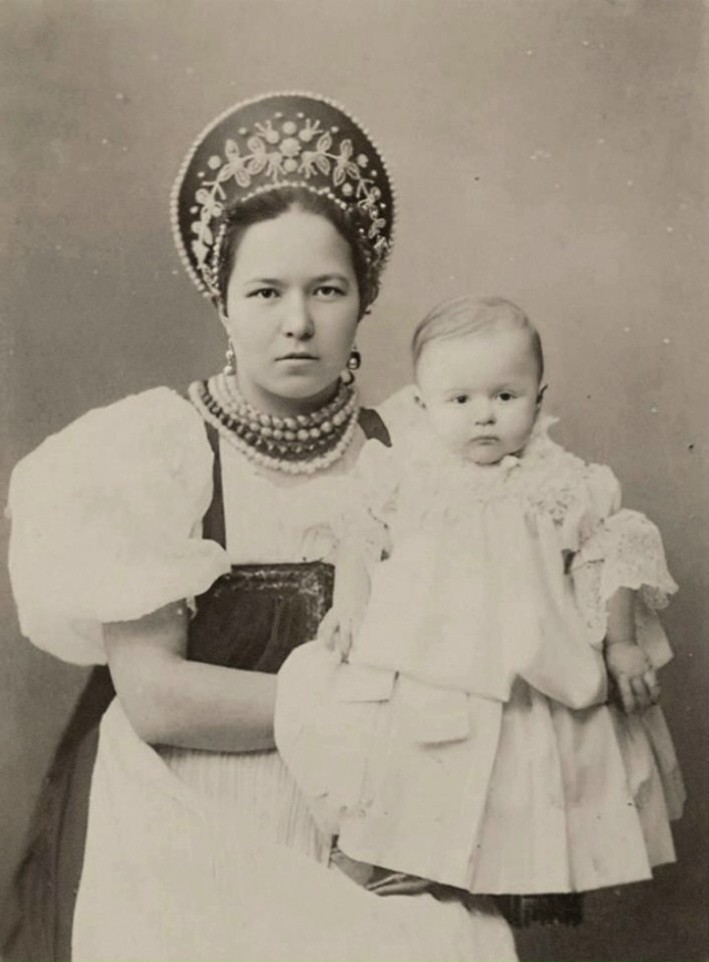 И постоянно можно было встретить чинно выступавшую рядом со своей по моде одетой барыней толстую, краснощёкую мамку в парчовой кофте с пелеринкой, увешанную бусами и в кокошнике - розовом, если она кормила девочку, и голубом, если мальчика. А летом её наряжали в цветной сарафан со множеством мелких золотых или стеклянных пуговок на подоле и с кисейными пузырями рукавов..."